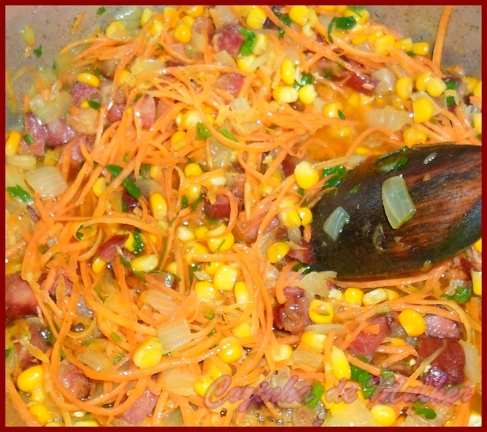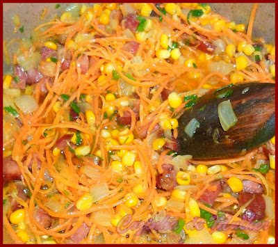 Em uma panela coloque um pouquinho de óleo e frite o bacon, depois a calabresa, quando estiverem fritinhos, acrescente a cebola e continue a refogar, acrescente os caldos de bacon e espere que dissolva bem, depois acrescente o milho, a cenoura e o cheiro verde, mexa bem e aos poucos vá acrescentando a farinha.